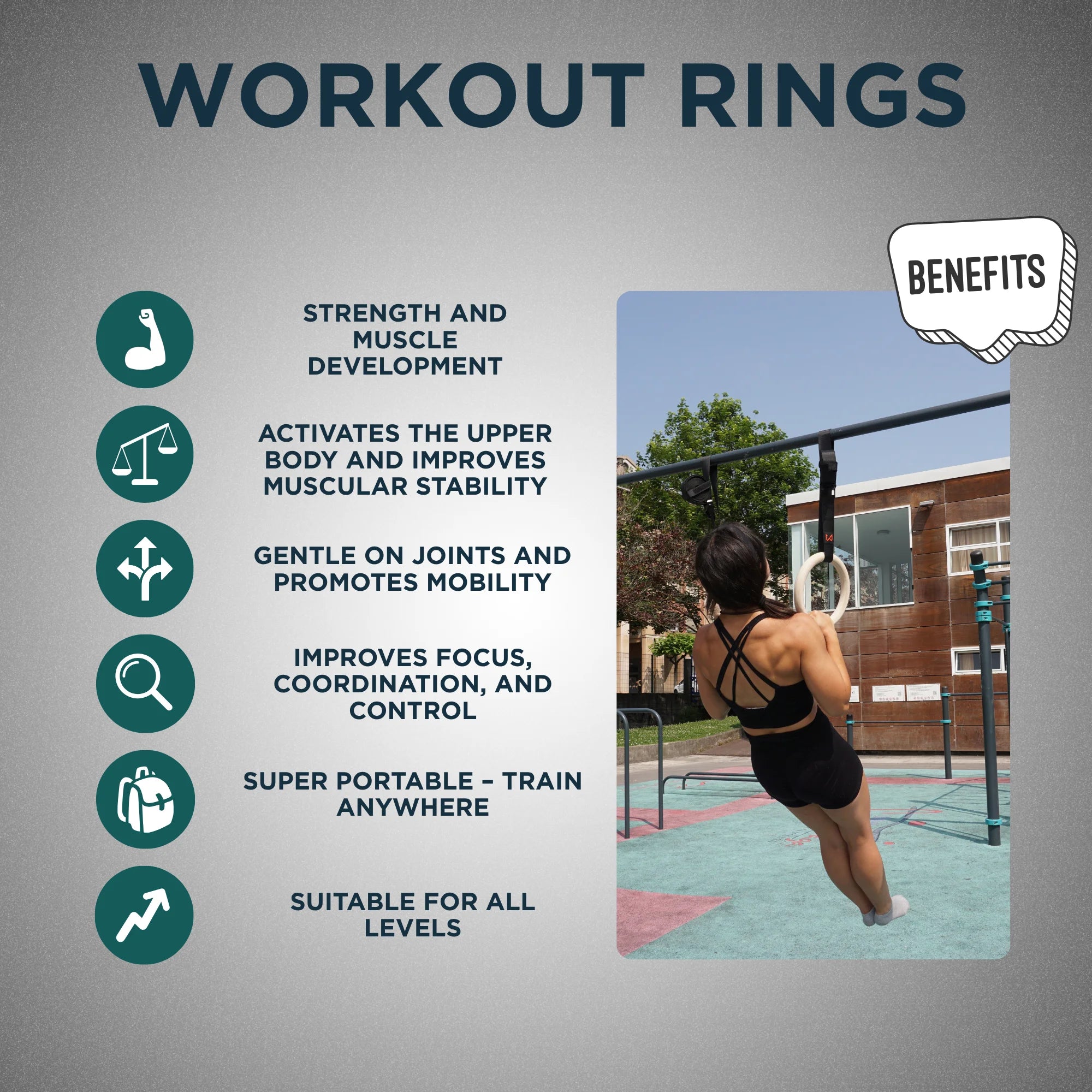 Dotés d'une finition lisse et agréable au toucher , ces anneaux conviennent à la callisthénie, au CrossFit, à la gymnastique et à la musculation fonctionnelle. Leur surface offre une friction suffisante pour un contrôle optimal sans usure excessive des mains, ce qui les rend parfaits pour les débutants comme pour les athlètes confirmés. Leur portabilité vous permet de les installer à l'intérieur, à l'extérieur ou même en voyage, pour une séance d'entraînement sans interruption. Parfaits pour des exercices comme les dips, le rowing, les tractions, les maintiens statiques et les muscle-ups, ils peuvent également être combinés avec notre pack callisthénie lestée pour un entraînement au poids du corps optimal.
